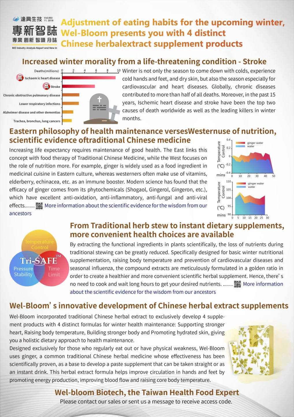 Wel-Bloom incorporated traditional Chinese herbal extract to exclusively develop 4 supplement products with 4 distinct formulas for winter health maintenance: Supporting a stronger heart, Raising body temperature, Building a stronger body, and Promoting hydrated skin, giving you a holistic dietary approach to health maintenance.