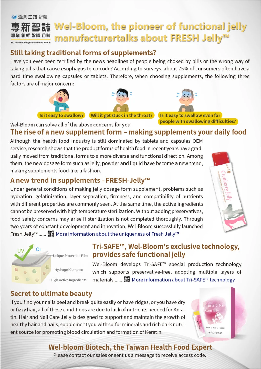 Under general conditions of making jelly dosage form supplement, problems such as hydration, gelatinization, layer separation, firmness, and compatibility of nutrients with different properties are commonly seen. At the same time, the active ingredients cannot be preserved with high-temperature sterilization. Without adding preservatives, food safety concerns may arise if sterilization is not completed thoroughly. Through two years of constant development and innovation, Wel-Bloom successfully launched Fresh Jelly™……More information about the uniqueness of Fresh Jelly™