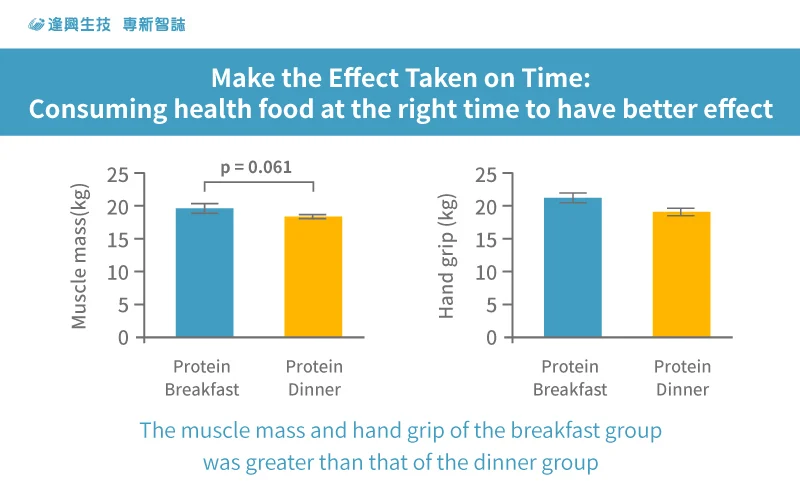 In a study by Aoyama et al. in 2021, 60 elderly women were divided into breakfast and dinner groups[1]. They consumed the same amount of protein in total but were divided according to the protein intake amounts of breakfast and dinner. The study found that women who consumed more protein at breakfast had a faster rate of muscle weight gain than women who consumed more protein at dinner. Women who consumed more protein at breakfast had approximately 16% more grip strength than women who consumed more protein at dinner. The results of the study also showed that following the muscle clock for protein supplementation will increase the speed of muscle growth. Therefore, the concept of “Precise Nutrition, Just in Time” is particularly important.