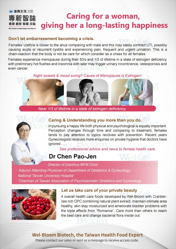 4 overall health care foods developed by Wel-Bloom with Cranberries rich OPC combining natural plant extract, maintain intimate area healthy, skin stays moisturized and ameliorate bladder problems with the triple effects from “Romance”. Care more than others to reach the best care and change bacterial flora inside out.